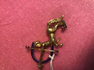 VINTAGE BLUE ENAMEL AND 14K GOLD PIN11 GRAMS OF GOLD WITH RUBY AND EMARLD